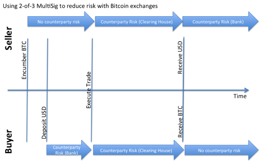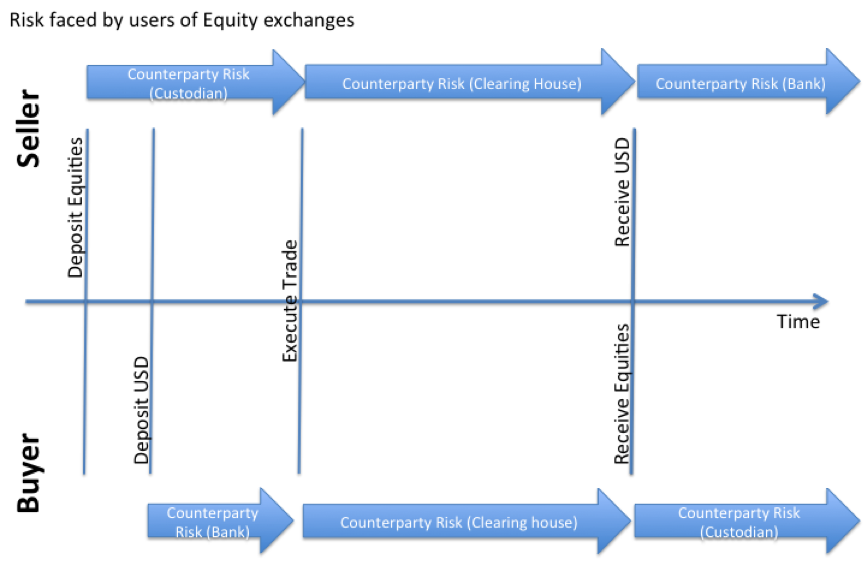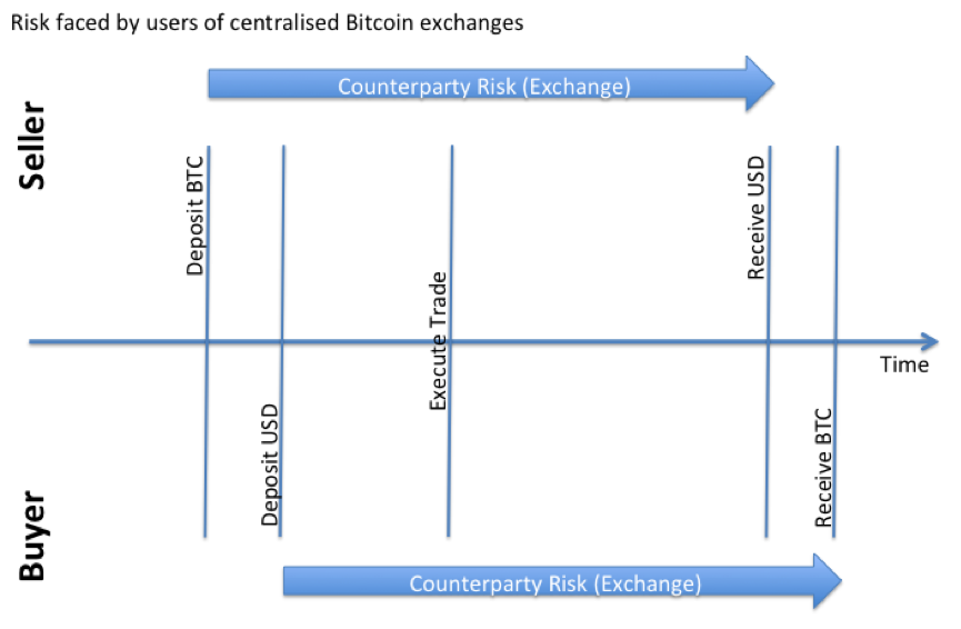 The diagram below shows the problem. From the time a buyer deposits cash or a seller deposits Bitcoins, they are utterly dependent on the solvency of that exchange until they withdraw their funds at some later date. You have counterparty exposure to the exchange for all this time.