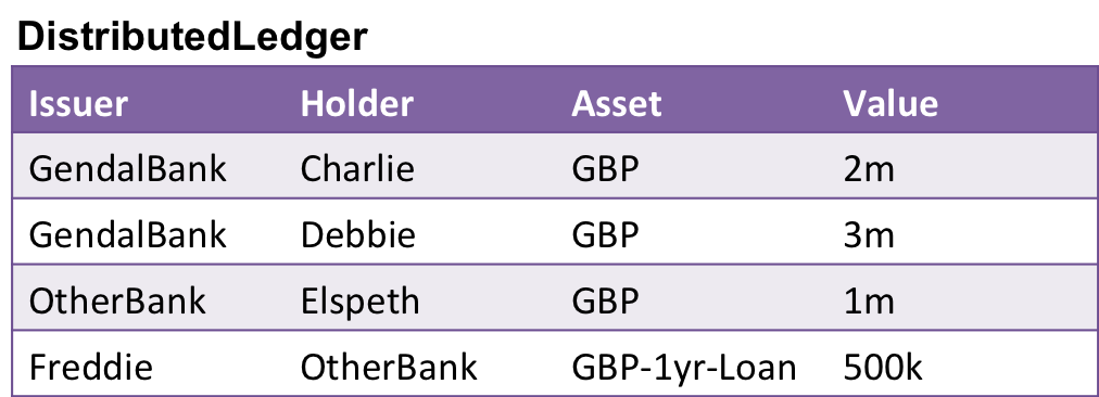 And, if this is true, we’re going to need to represent the idea that Alice has a £500k deposit at GendalBank or that Freddie has borrowed £500k from “OtherBank”. And this is only going to work if everybody building this systems has a deep, intuitive sense that “deposits” should be modelled as “claims against an identifiable entity” and that £500k at GendalBank is fundamentally different to £500k at OtherBank and so on. I think we need to be thinking in terms of a “four-column model” of “issuer”, “holder”, “assetID” and “quantity”: