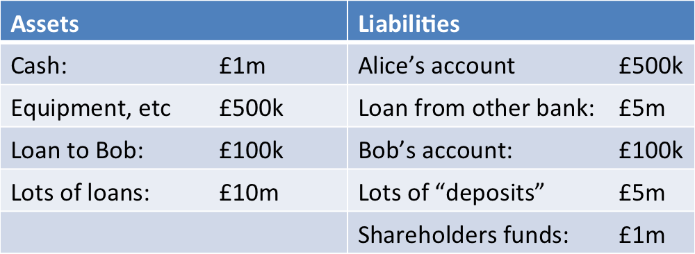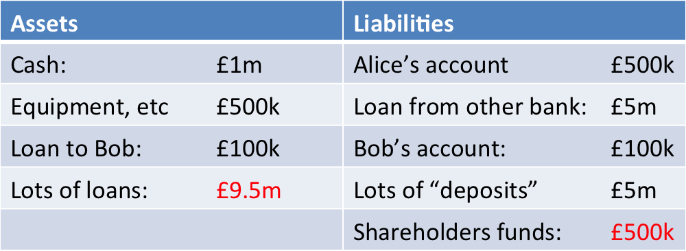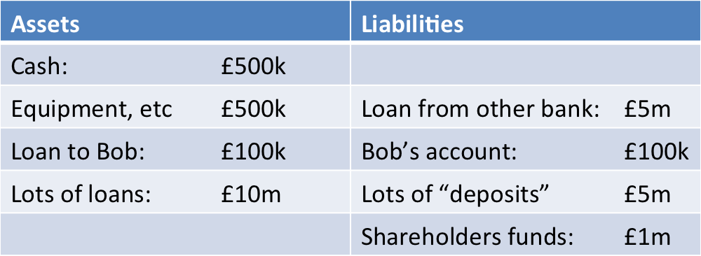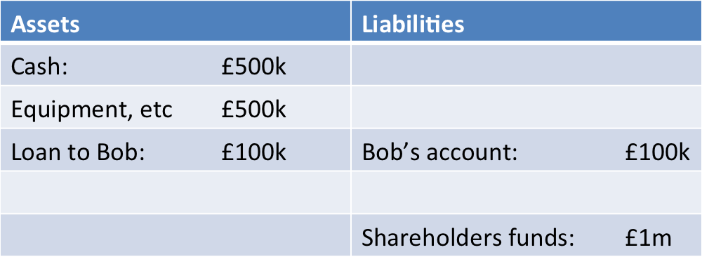 And now look at the liability side: it records that we owe £100k to Bob. That’s fair enough. If he looks at his account, he’ll see £100k there that he can withdraw whenever he likes. As far as he’s concerned he thinks “has £100k in the bank”.